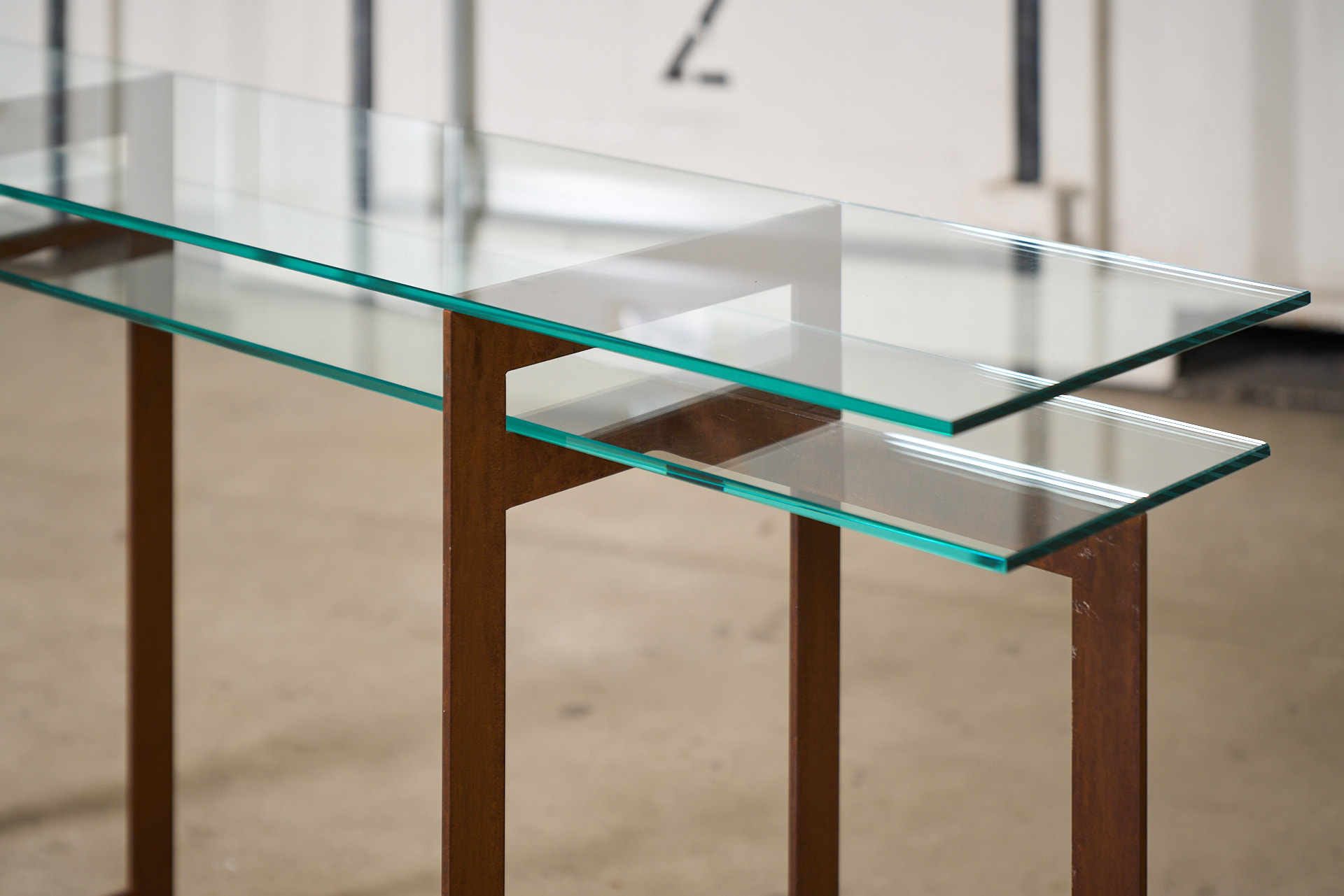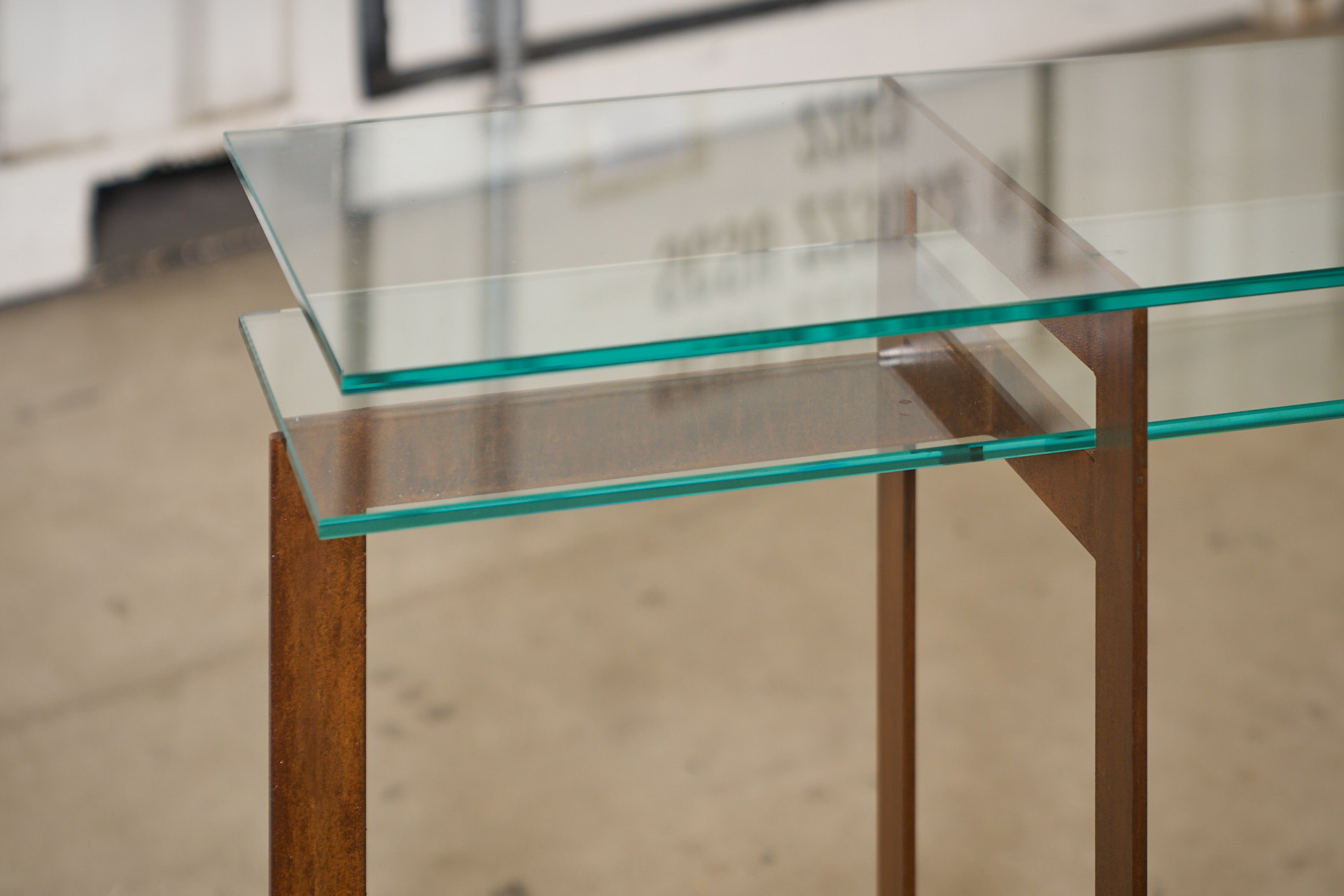 onderstel corten staal bladen van glas 160 cm X 40 cm X h. 75 cm